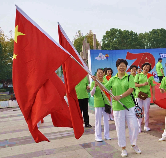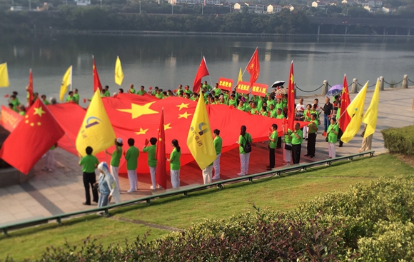 金色的晨曦中,鮮艷的五星紅旗迎風(fēng)招展,紅旗的映襯下,身為中華兒女的麗汽人笑容綻放、步伐矯健,《我和我的祖國》那熟悉的旋律在防洪堤的上空久久回蕩……
