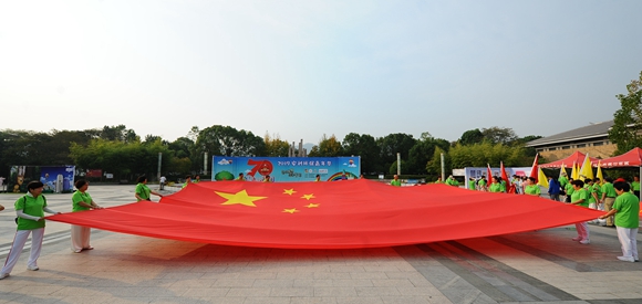 9月29日一早的濱水公園,在8面紅旗和8面麗汽集團(tuán)司旗的簇?fù)硐拢?/span>16名旗手莊重地鋪展開一面巨幅國旗。早早趕來的麗汽員工和在公園晨練的市民紛紛在國旗前拍照留念。那一抹鮮艷的中國紅,映照出的不僅是人們的笑臉,還有所有人心中對(duì)祖國的依戀。
